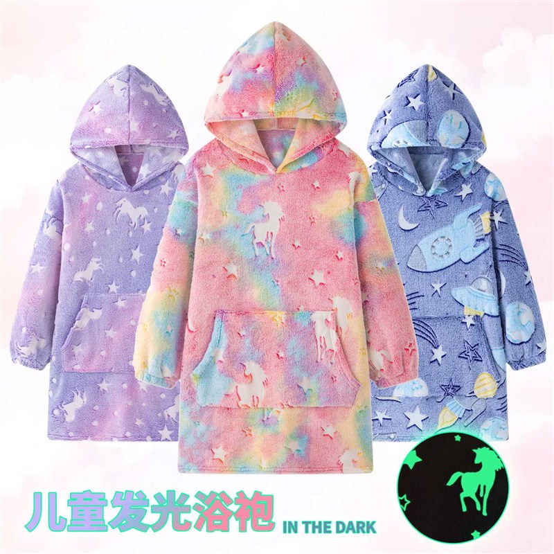 夜發光兒童加g厚衛衣絨衫法蘭絨連帽睡袍秋冬保暖男女卡通動物睡