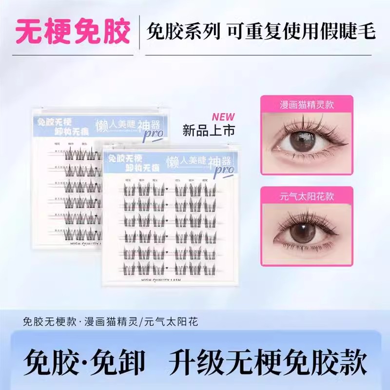 魚小丫假睫毛免膠太陽花新手自然仿真卷翹免膠免卸自粘分段假睫毛