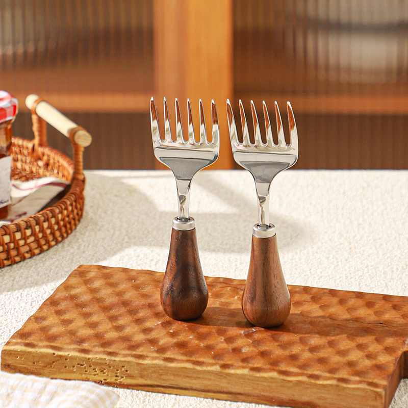 舍里 304不銹鋼可站立短柄叉子家用兒童吃飯餐具胡桃木手柄六齒叉