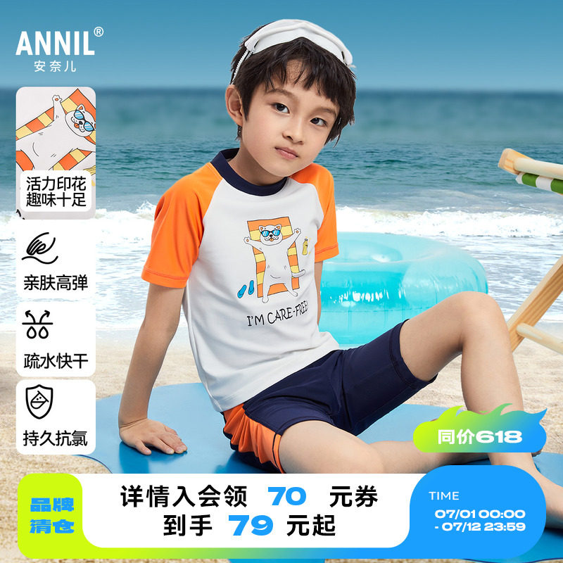 安奈兒童裝男童分體泳衣套裝2025夏款速干游泳訓練溫泉度假配泳帽