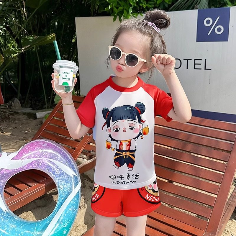 女童泳衣兒童分體短袖套裝小女孩沙灘度假游泳衣速干爆款哪吒泳裝