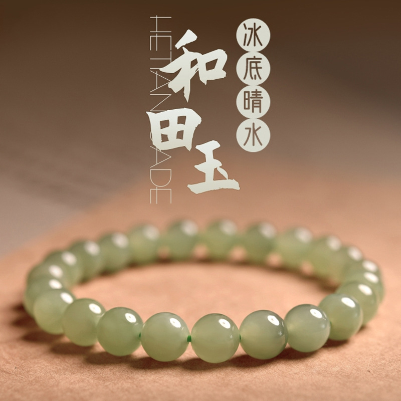 天然俄羅斯碧玉鴨蛋青料圓珠手鏈 男女款碧玉玉石手串飾品禮物
