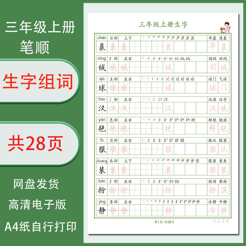 三年級上冊生字組詞筆順電子字帖學生描紅練字帖單行需打印共28頁