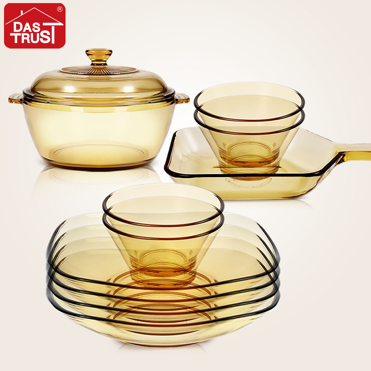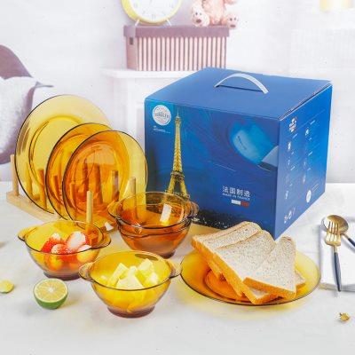 美國康寧餐具琥珀色碗魚盤家用耐高溫微烤兩用鋼化玻璃碗禮盒套裝