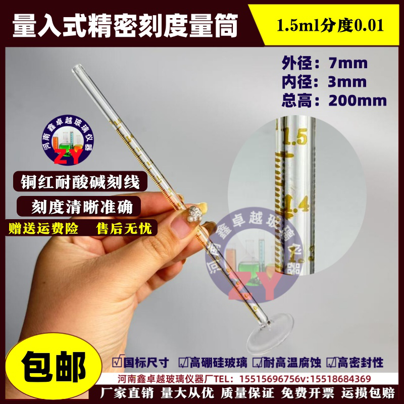 精密刻度量筒1.5ml分度0.01微小型量入式高精度玻璃量筒包檢帶證