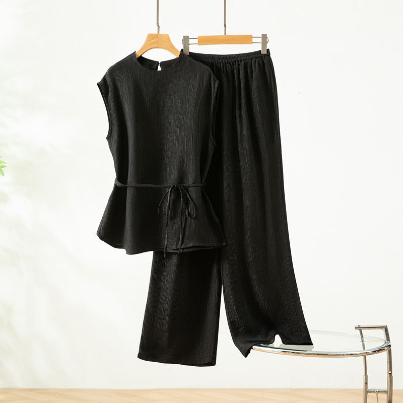 時尚潮流 隨性優雅20姆米真絲提花冠樂縐圓領無袖襯衫/直筒褲套裝