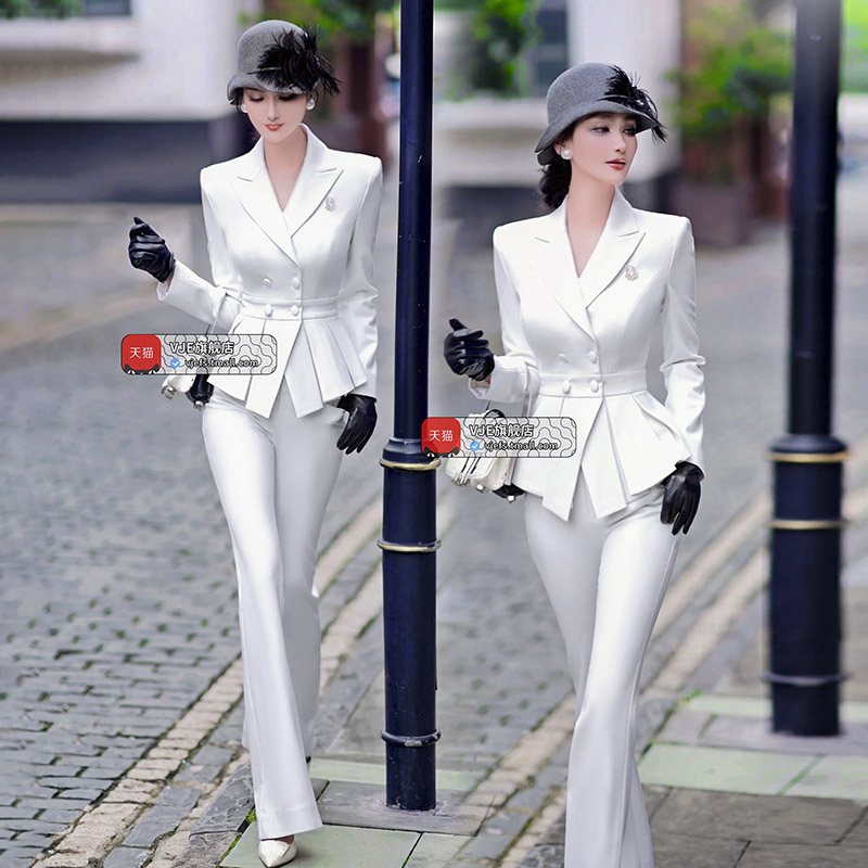 VJE秋季職業洋氣西服套裝新款收腰雙排扣外套喇叭褲兩件套