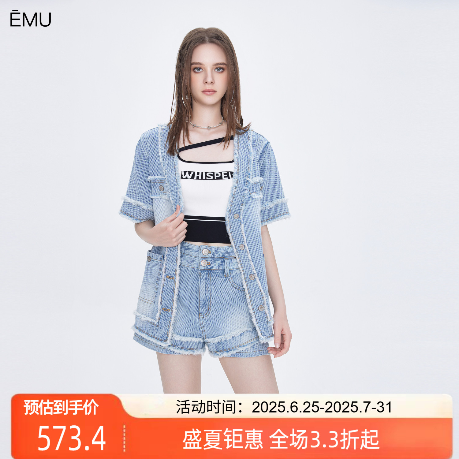 依妙EMU提花毛邊寬松短袖牛仔外套短款套裝女2025夏款潮流兩件套