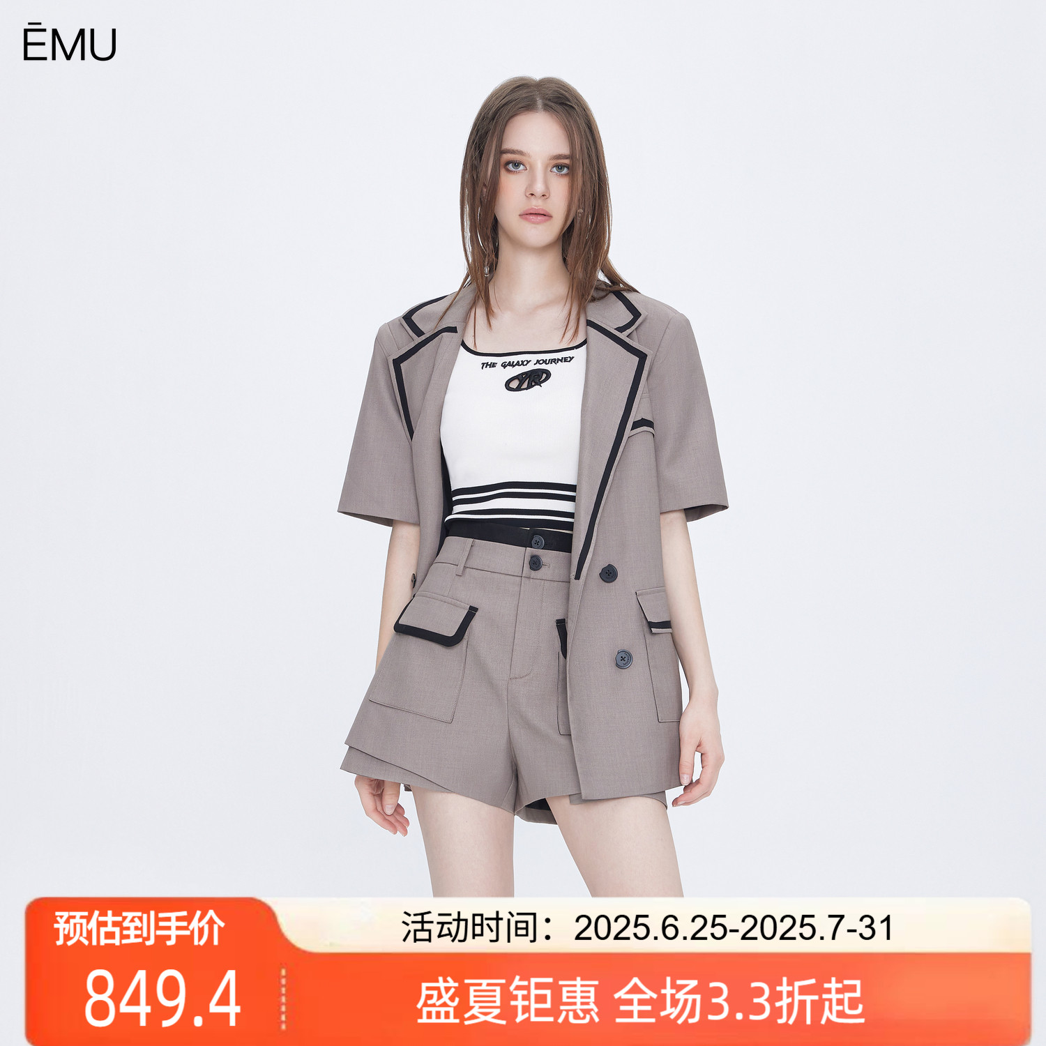 依妙EMU撞色邊寬松短袖西裝外套短款套裝女2025潮流百搭兩件套