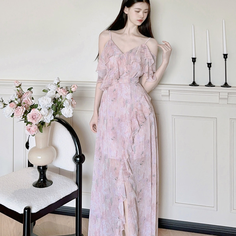 「晚櫻」茶歇法式雪紡連衣裙女夏溫柔度收腰粉色碎花長裙