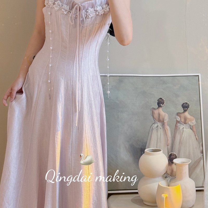 「紫羅蘭」法式立體花裝飾系帶修身溫柔顯瘦春夏吊帶連衣裙