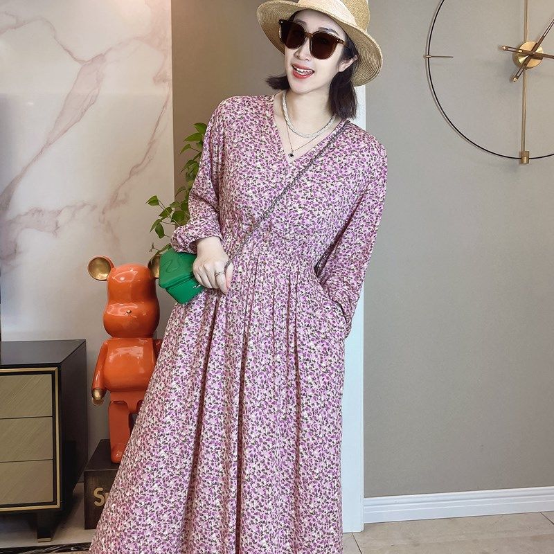 高貨長袖棉綢連衣裙子碎花裙印人造棉春秋夏季氣質中長款寬松