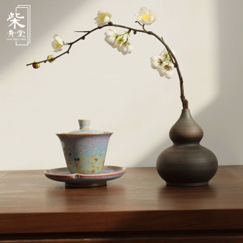 柴青堂鈞窯窯變孔雀石釉開片可養線全手工花瓣中式復古三才蓋碗