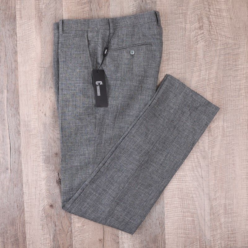 94男士青年亞麻商務直筒西褲灰修身厚款透T氣通勤休閑褲春