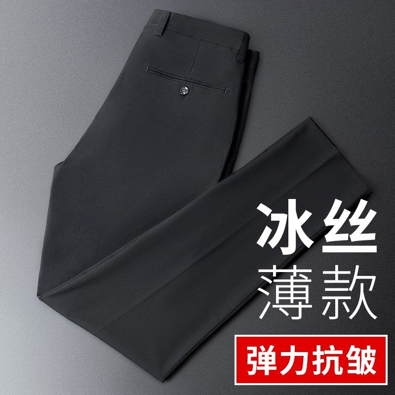夏季男士西褲商務修身冰絲彈力薄款黑色職業西裝T褲抗皺質感單褲