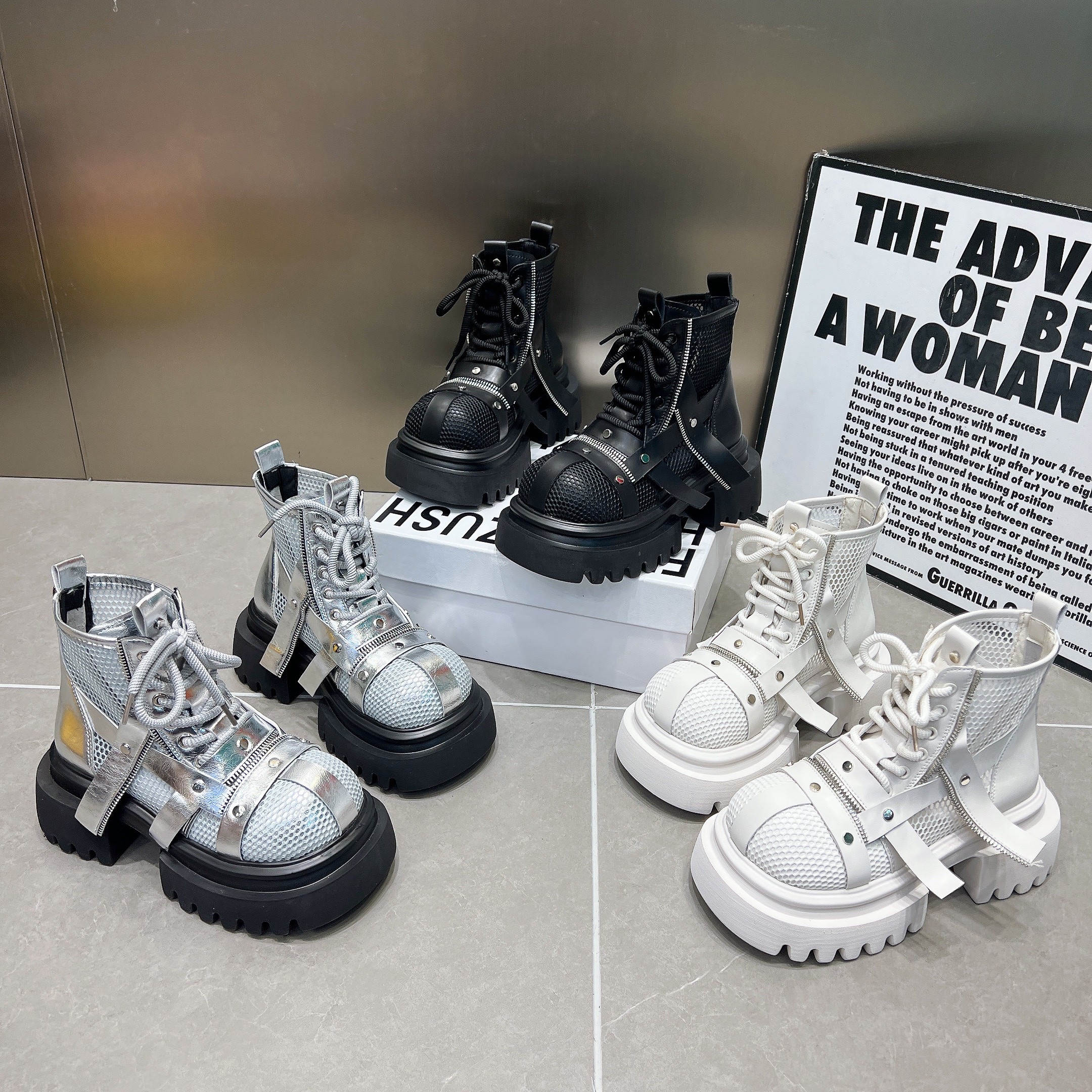 大頭馬丁靴女鞋2025新款真皮網面金屬拉鏈透氣機車靴厚底系帶涼靴