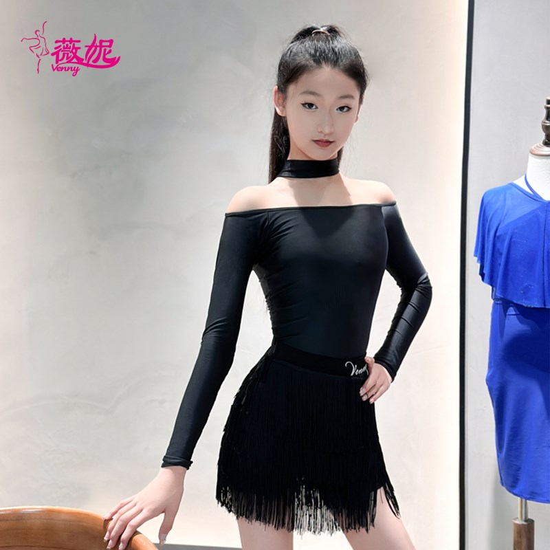 薇妮拉丁舞服春秋新款網紅圍脖長袖黑色流蘇標Q準舞蹈練功服女兒
