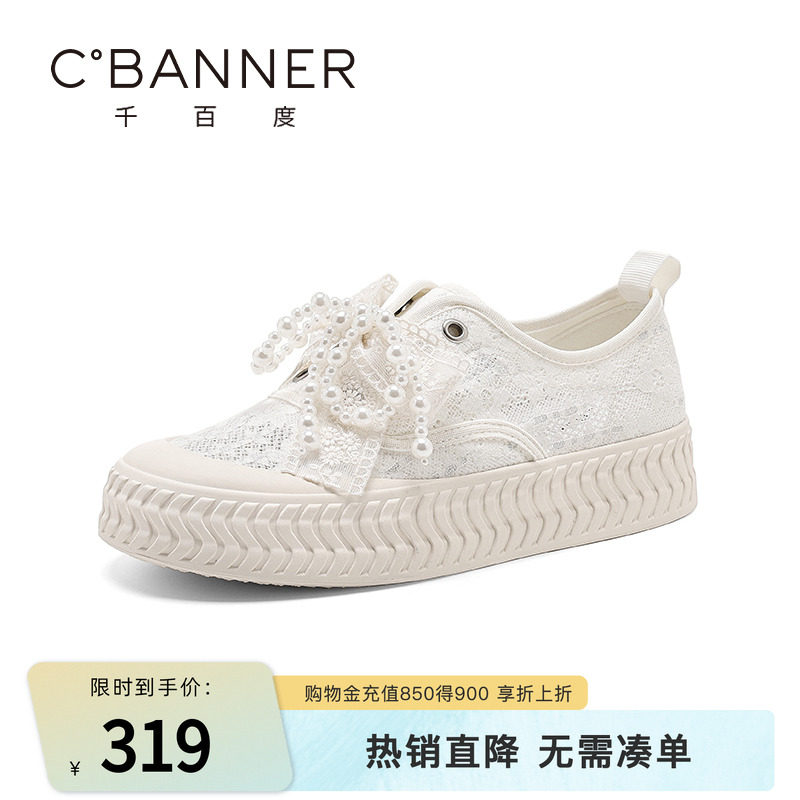 千百度小白鞋女2025夏季新款百搭珍珠蕾絲透氣網面軟底休閑鞋板鞋