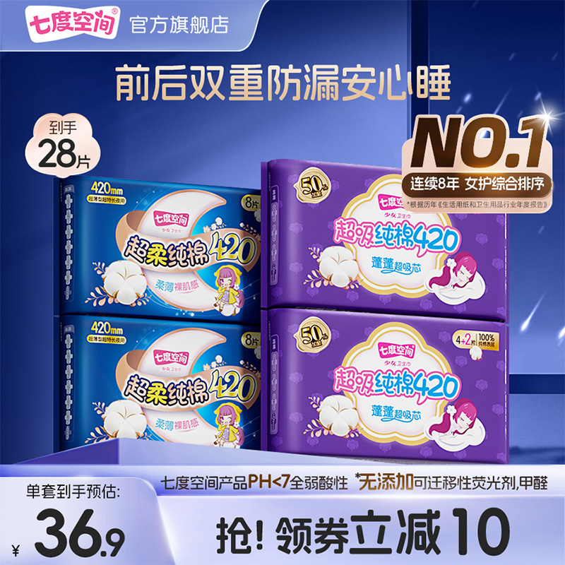 七度空間衛生巾少女純棉超長經期夜用420純棉338姨媽巾官方正品店